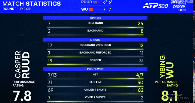 制胜分方面,吴易昺有24个正手制胜分和8个反手制胜分,鲁德则只消7个制胜分和2个反手制胜分。