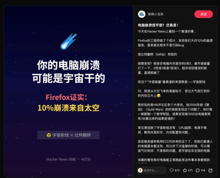 就比如在开端帖子里讲的火狐浏览器崩溃中,敷陈其实只说了崩溃有 10% 是比特翻转引起的,至于又是什么导致了比特翻转,东谈主可没说是天地射线。
