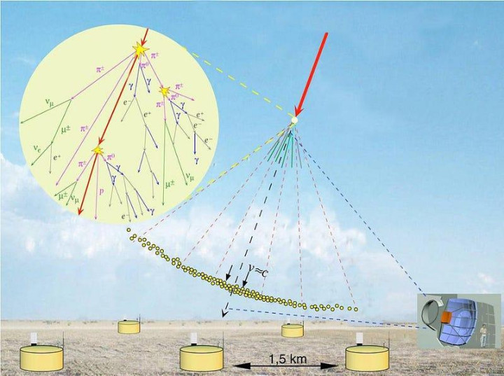 最初射线里的粒子得穿过大层,和空气中的粒子各式交锋碰撞,碰撞的末端即是层层炸开,产生级联响应,形成像大喇叭雷同的空气簇射。