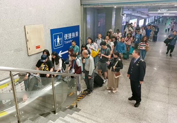 桂林北站使命主谈主员在出站电梯口造就旅客有序乘梯。郑长贤摄