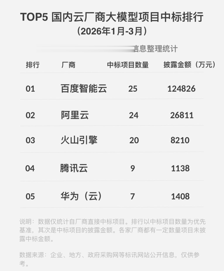 其中,百度(09888.HK)智能云以25个表情、12.48亿元的金额强势领跑,金额范围是第二名近5倍,稳居“双冠王”宝座。阿里巴巴(09988.HK)旗下阿里云与字节超过旗下的火山引擎分列二三位,分裂中标24个表情、金额2.68亿元和20个表情、金额8210万元。