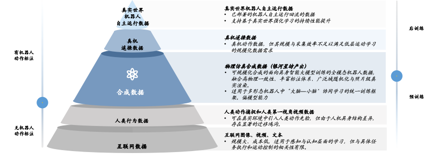 中间层(仿真合成数据): 通过海量、低资本、各样化的虚构数据,让机器东谈主在仿真中遍历各式可能性,从而逾越虚实规模。
